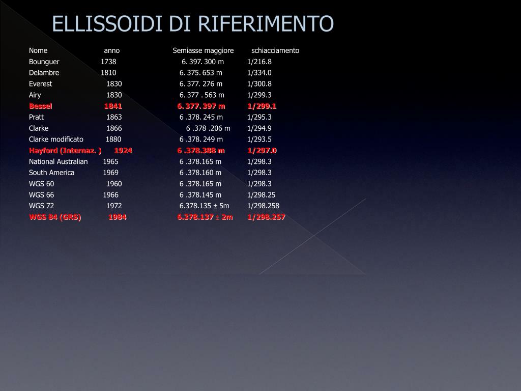 Nome anno Semiasse maggiore schiacciamento Bounguer 1738 6.397.300 m 1/216.8 Delambre 1810 6.375.653 m 1/334.0 Everest 1830 6.377. 276 m 1/300.8 Airy 1830 6.377 .563 m 1/299.3 Bessel 1841 6.377.397 m 1/299.1 Pratt 1863 6 .378.245 m 1/295.3 Clarke 1866 6 .378 .206 m 1/294.9 Clarke modificato 1880 6 .378.249 m 1/293.5 Hayford (Internaz. ) 1924 6 .378.388 m 1/297.0 National Australian 1965 6 .378.165 m 1/298.3 South America 1969 6 .378.160 m 1/298.3 WGS 60 1960 6 .378.165 m 1/298.3 WGS 66 1966 6 .378.145 m 1/298.25 WGS 72 1972 6.378.135 ± 5m 1/298.258 WGS 84 (GRS) 1984 6.378.137 ± 2m 1/298.257