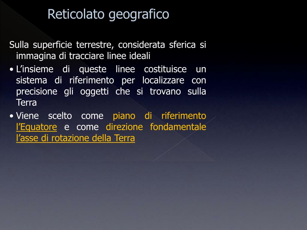 Reticolato geografico • Sulla superficie terrestre, considerata sferica si immagina di tracciare linee ideali • L’insieme di queste linee costituisce un sistema di riferimento per localizzare con precisione gli oggetti che si trovano sulla Terra • Viene scelto come piano di riferimento l’Equatore e come direzione fondamentale l’asse di rotazione della Terra