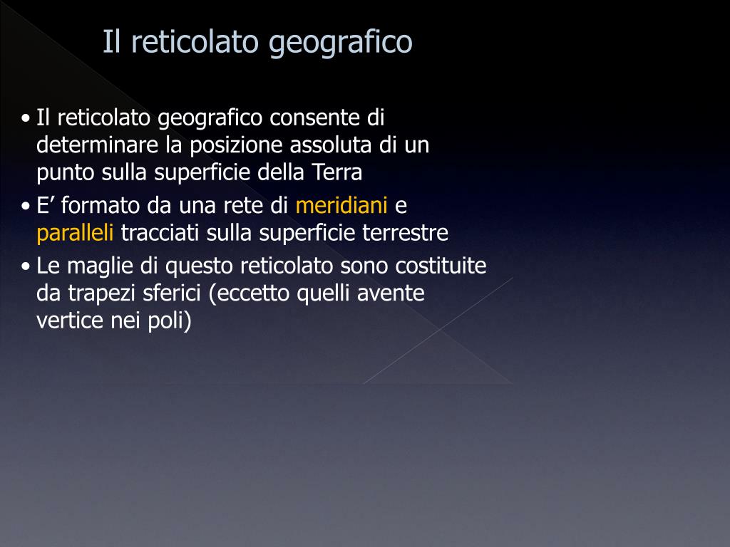 Il reticolato geografico • Il reticolato geografico consente di determinare la posizione assoluta di un punto sulla superficie della Terra • E’ formato da una rete di meridiani e paralleli tracciati sulla superficie terrestre • Le maglie di questo reticolato sono costituite da trapezi sferici (eccetto quelli avente vertice nei poli)