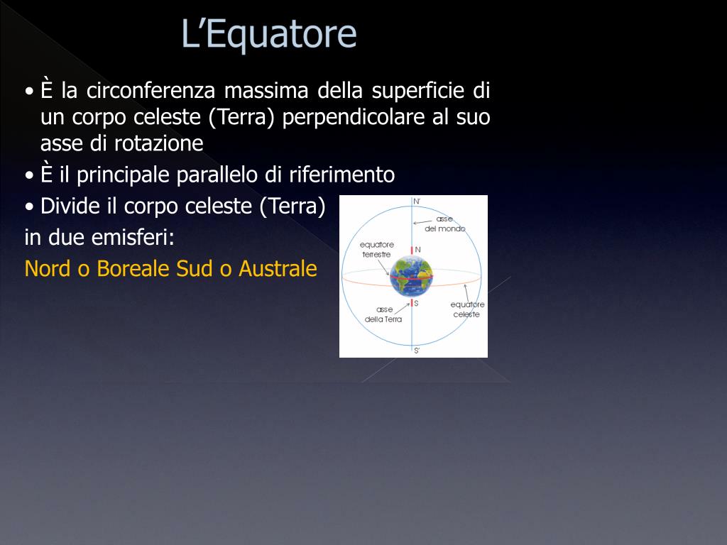 È la circonferenza massima della superficie di un corpo celeste (Terra) perpendicolare al suo asse di rotazione • È il principale parallelo di riferimento • Divide il corpo celeste (Terra) • in due emisferi: • Nord o Boreale Sud o Australe