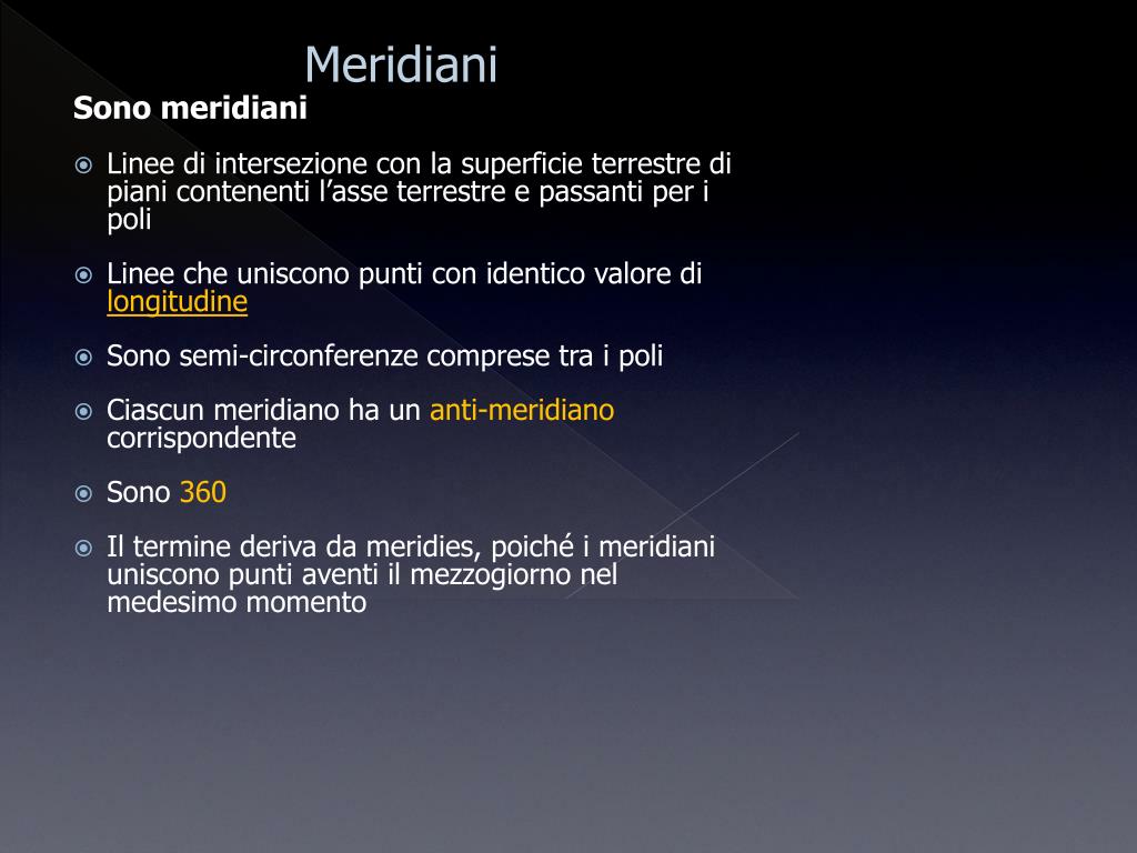 Meridiani Sono meridiani • Linee di intersezione con la superficie terrestre di piani contenenti l’asse terrestre e passanti per i poli • Linee che uniscono punti con identico valore di longitudine • Sono semi-circonferenze comprese tra i poli • Ciascun meridiano ha un anti-meridiano corrispondente • Sono 360 • Il termine deriva da meridies, poiché i meridiani uniscono punti aventi il mezzogiorno nel medesimo momento