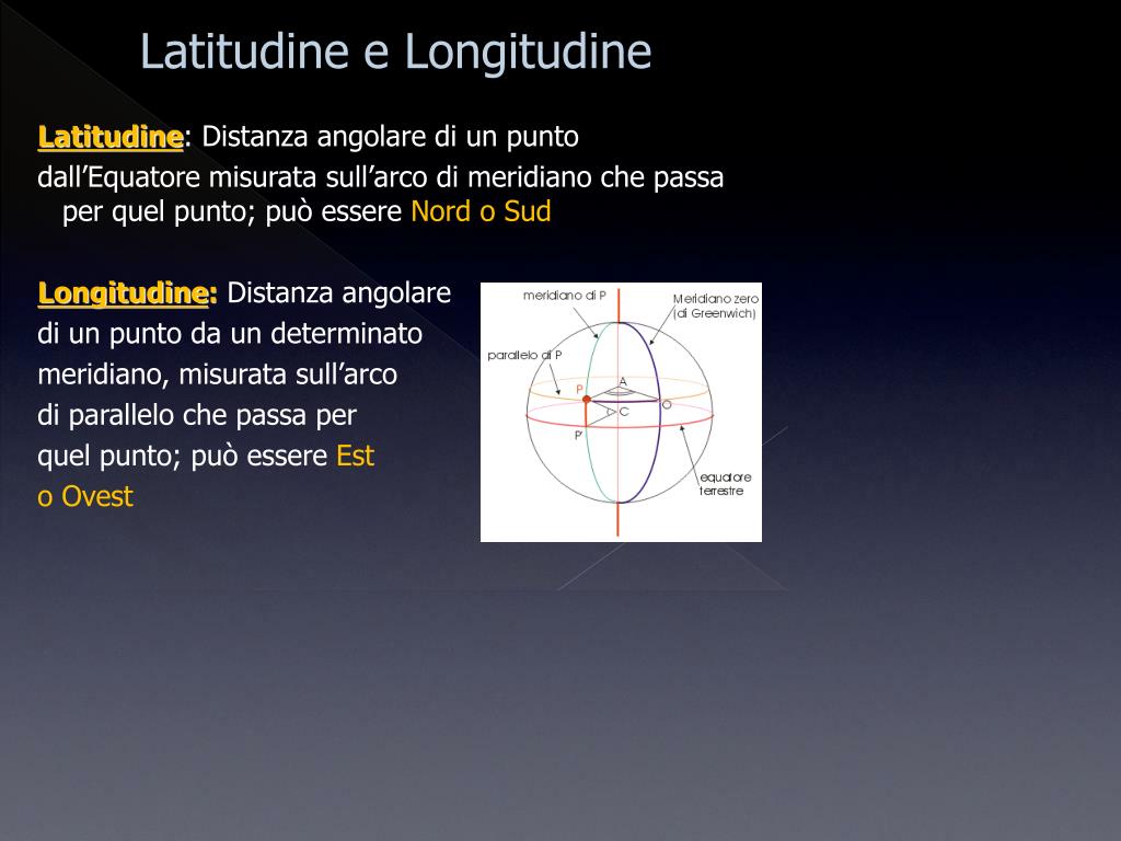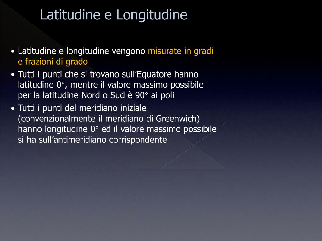 Latitudine e Longitudine Latitudine: Distanza angolare di un punto dall’Equatore misurata sull’arco di meridiano che passa per quel punto; può essere Nord o Sud Longitudine: Distanza angolare di un punto da un determinato meridiano, misurata sull’arco di parallelo che passa per quel punto; può essere Est o Ovest