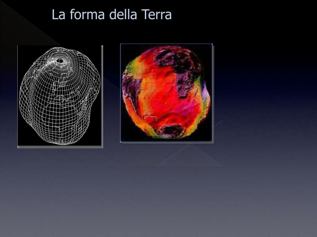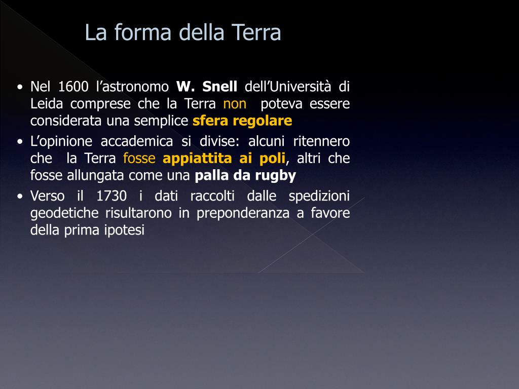 La forma della Terra • Nel 1600 l’astronomo W. Snell dell’Università di Leida comprese che la Terra non poteva essere considerata una semplice sfera regolare • L’opinione accademica si divise: alcuni ritennero che la Terra fosse appiattita ai poli, altri che fosse allungata come una palla da rugby • Verso il 1730 i dati raccolti dalle spedizioni geodetiche risultarono in preponderanza a favore della prima ipotesi