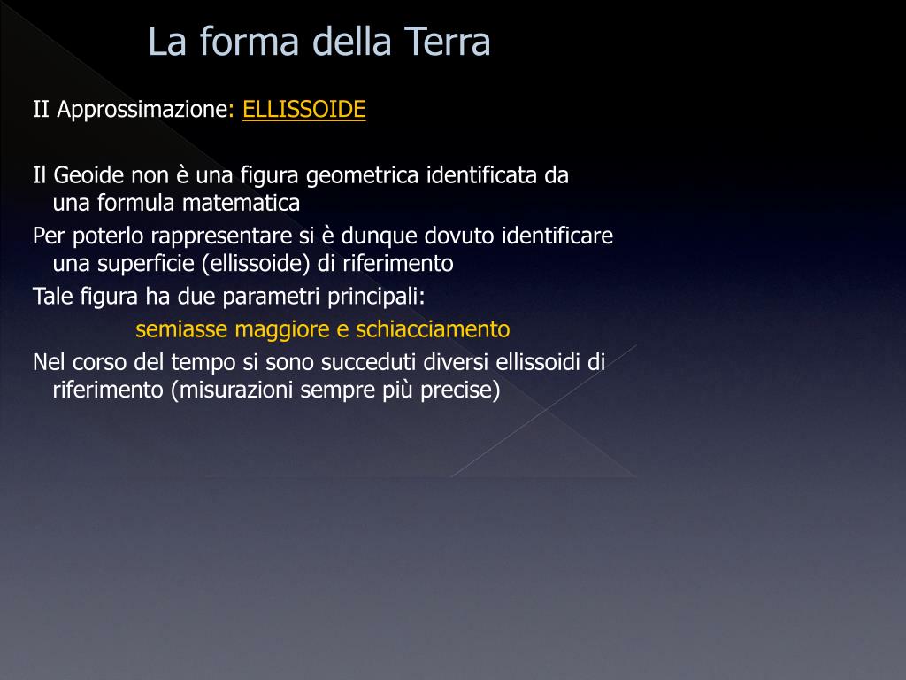 La forma della Terra II Approssimazione: ELLISSOIDE Il Geoide non è una figura geometrica identificata da una formula matematica Per poterlo rappresentare si è dunque dovuto identificare una superficie (ellissoide) di riferimento Tale figura ha due parametri principali: semiasse maggiore e schiacciamento Nel corso del tempo si sono succeduti diversi ellissoidi di riferimento (misurazioni sempre più precise)