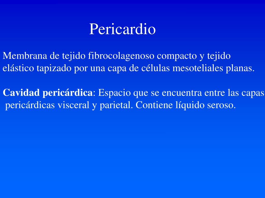 Pericardio Membrana de tejido fibrocolagenoso compacto y tejido elástico tapizado por una capa de células mesoteliales planas. Cavidad pericárdica: Espacio que se encuentra entre las capas pericárdicas visceral y parietal. Contiene líquido seroso.