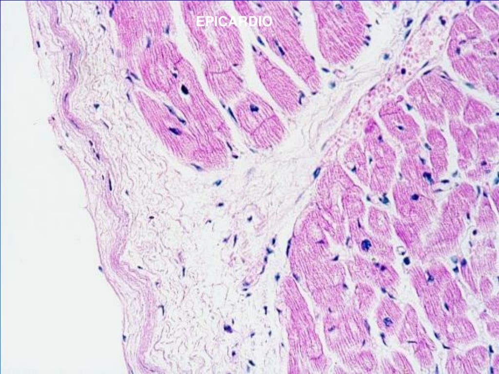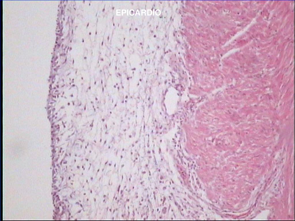CORAZON Pared cardiaca (3 capas) -Epicardio : - capa fibrosa interna de tejido conectivo - capa serosa externa o mesotelio ( capa visceral del pericardio). -Miocardio:formado por varias capas de células musculares estriadas cardíacas de diferente orientación. -Endocardio: formado por un endotelio y un subendotelio que es una fina capa de tejido conectivo laxo.