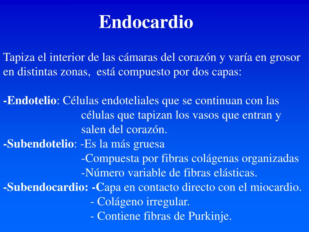 Endocardio Tapiza el interior de las cámaras del corazón y varía en grosor en distintas zonas, está compuesto por dos capas: -Endotelio: Células endoteliales que se continuan con las células que tapizan los vasos que entran y salen del corazón. -Subendotelio: -Es la más gruesa -Compuesta por fibras colágenas organizadas -Número variable de fibras elásticas. -Subendocardio: -Capa en contacto directo con el miocardio. - Colágeno irregular. - Contiene fibras de Purkinje.