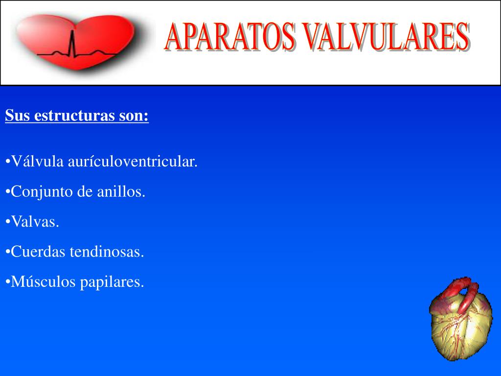 APARATOS VALVULARES Sus estructuras son: • Válvula aurículoventricular. • Conjunto de anillos. • Valvas. • Cuerdas tendinosas. • Músculos papilares.