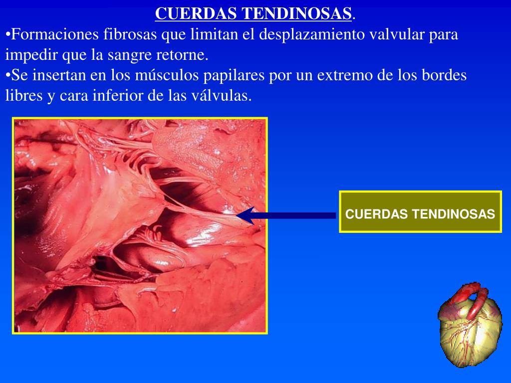 CUERDAS TENDINOSAS. • Formaciones fibrosas que limitan el desplazamiento valvular para impedir que la sangre retorne. • Se insertan en los músculos papilares por un extremo de los bordes libres y cara inferior de las válvulas. CUERDAS TENDINOSAS