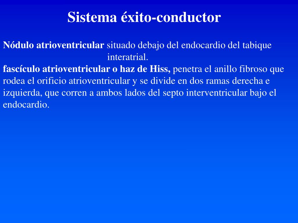 Sistema éxito-conductor Nódulo atrioventricular situado debajo del endocardio del tabique interatrial. fascículo atrioventricular o haz de Hiss, penetra el anillo fibroso que rodea el orificio atrioventricular y se divide en dos ramas derecha e izquierda, que corren a ambos lados del septo interventricular bajo el endocardio.