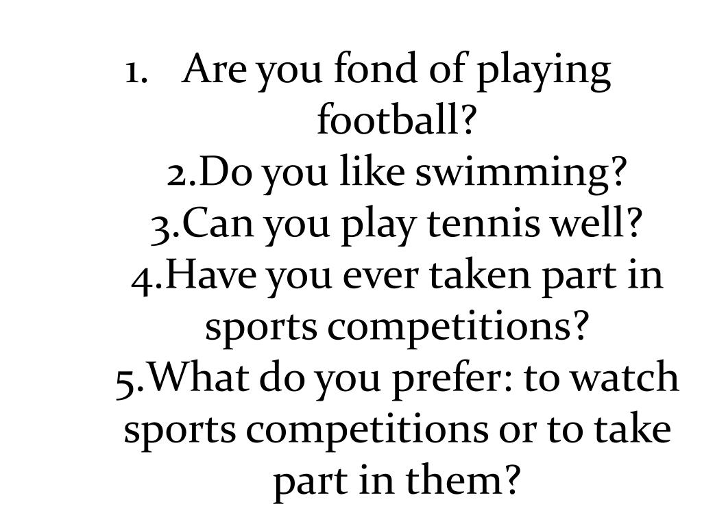 Are you fond of playing football?2.Do you like swimming?3.Can you play tennis well?4.Have you ever taken part in sports competitions?5.What do you prefer: to watch sports competitions or to take part in them?