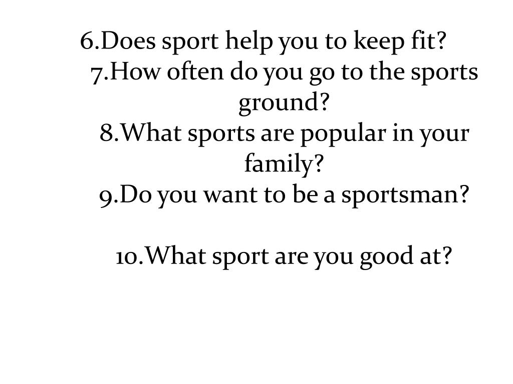6.Does sport help you to keep fit?7.How often do you go to the sports ground?8.What sports are popular in your family?9.Do you want to be a sportsman?10.What sport are you good at?