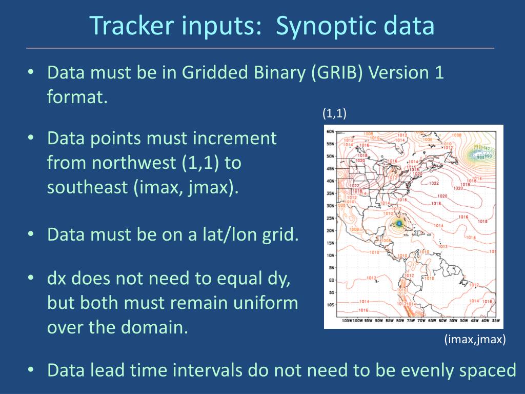 Tracker inputs: Synoptic data • Data must be in Gridded Binary (GRIB) Version 1 format. (1,1) • Data points must increment from northwest (1,1) to southeast (imax, jmax). • Data must be on a lat/lon grid. • dx does not need to equal dy, but both must remain uniform over the domain. (imax,jmax) • Data lead time intervals do not need to be evenly spaced