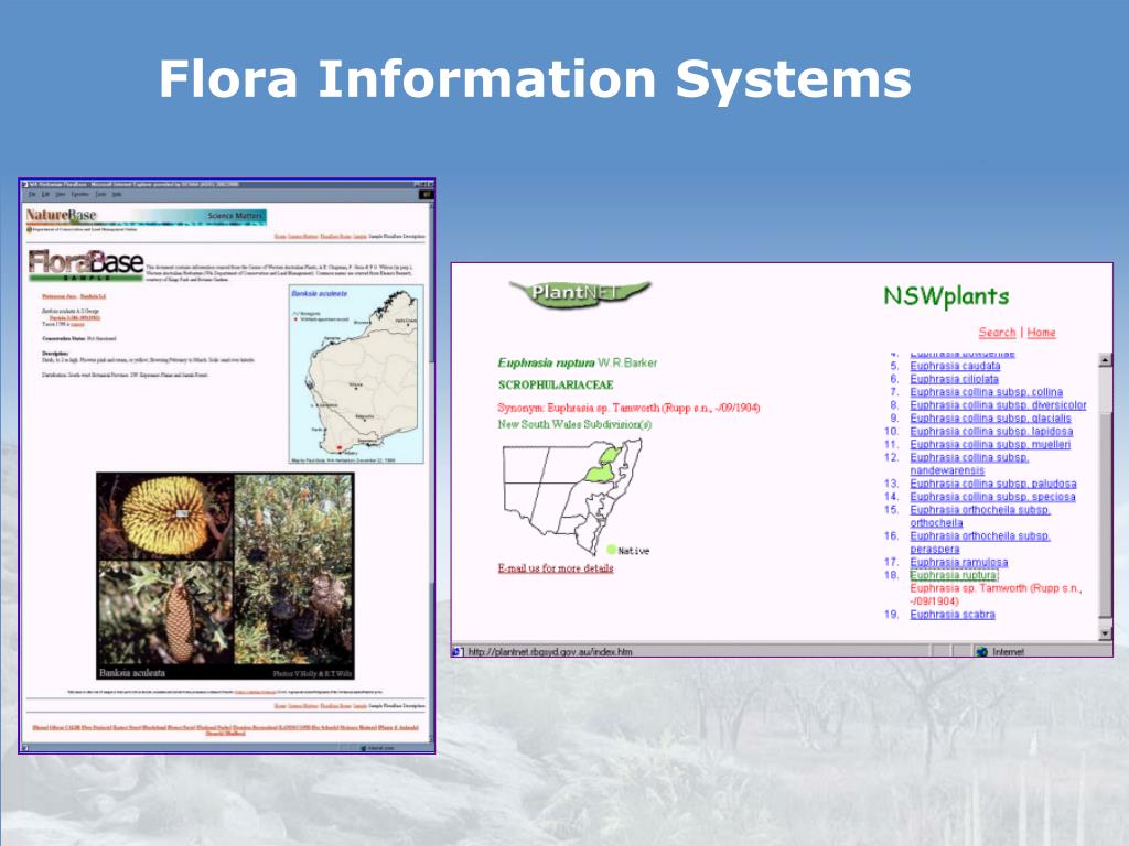 Flora Information Systems • Stand alone (CDROM) or on-line (WWW) • Generally regionally based • Integrating: • Plant names • Descriptive Flora treatments • Illustrations • Distributions