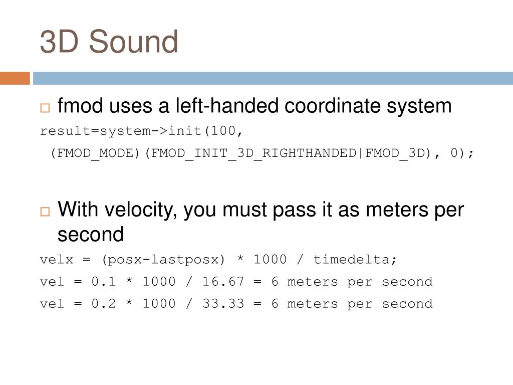 3D Sound • fmod uses a left-handed coordinate system result=system->init(100, (FMOD_MODE)(FMOD_INIT_3D_RIGHTHANDED|FMOD_3D), 0); • With velocity, you must pass it as meters per second velx= (posx-lastposx) * 1000 / timedelta; vel = 0.1 * 1000 / 16.67 = 6 meters per second vel = 0.2 * 1000 / 33.33 = 6 meters per second