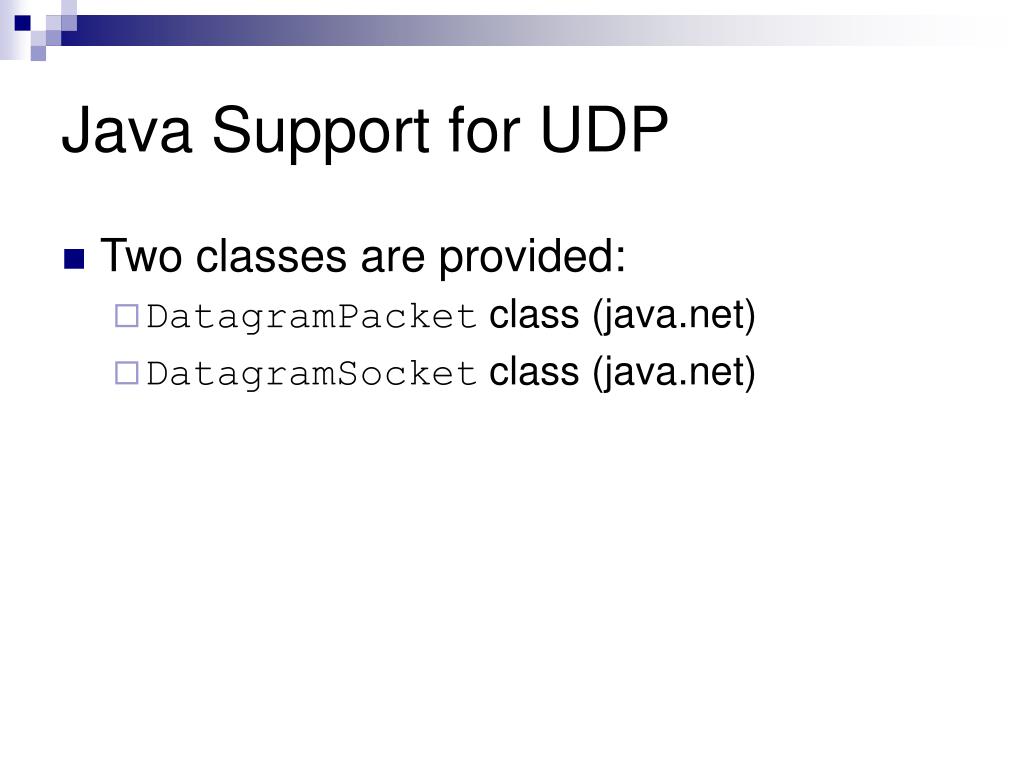 Java Support for UDP • Two classes are provided: • DatagramPacket class (java.net) • DatagramSocket class (java.net)
