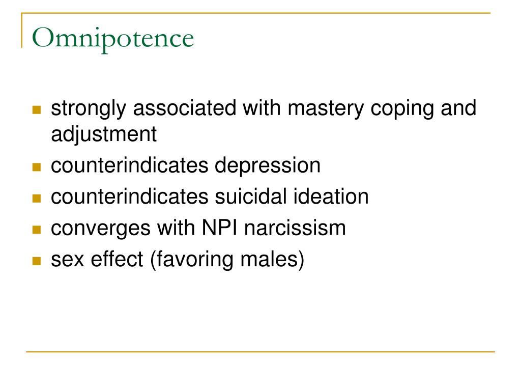 Omnipotence • strongly associated with mastery coping and adjustment • counterindicates depression • counterindicates suicidal ideation • converges with NPI narcissism • sex effect (favoring males)