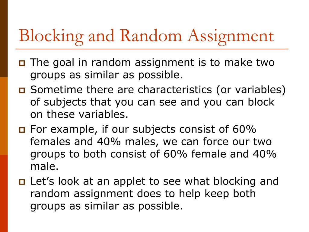 Blocking and Random Assignment • The goal in random assignment is to make two groups as similar as possible. • Sometime there are characteristics (or variables) of subjects that you can see and you can block on these variables. • For example, if our subjects consist of 60% females and 40% males, we can force our two groups to both consist of 60% female and 40% male. • Let’s look at an applet to see what blocking and random assignment does to help keep both groups as similar as possible.