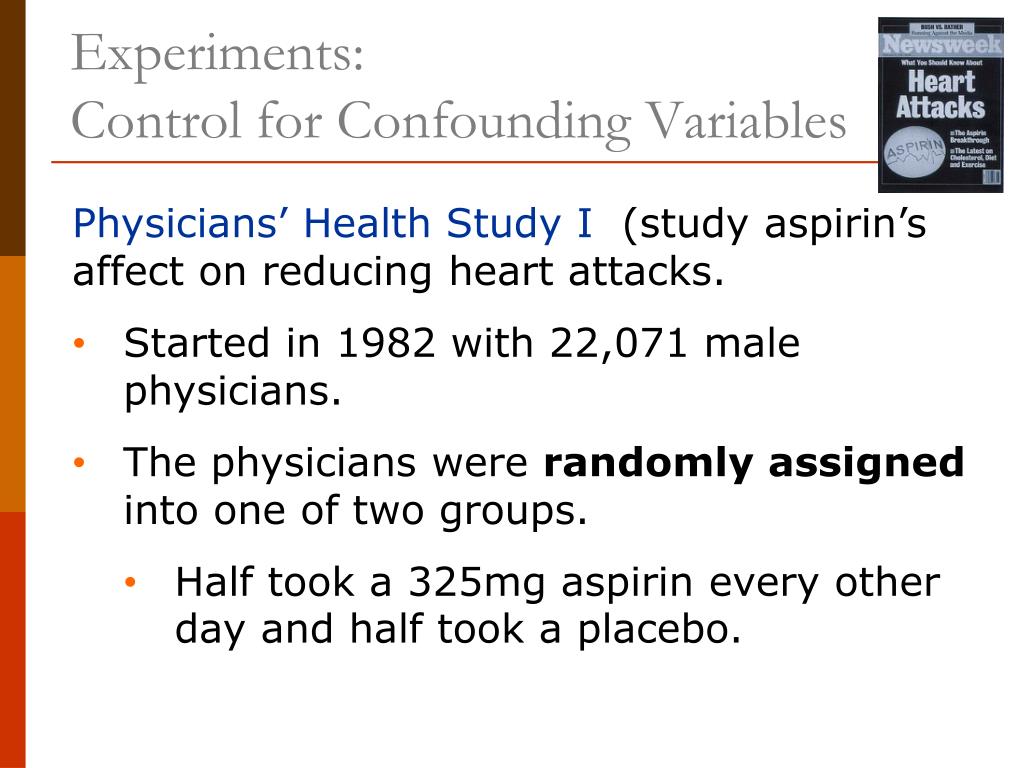 Experiments: Control for Confounding Variables • Physicians’ Health Study I (study aspirin’s affect on reducing heart attacks. • Started in 1982 with 22,071 male physicians. • The physicians were randomly assigned into one of two groups. • Half took a 325mg aspirin every other day and half took a placebo.