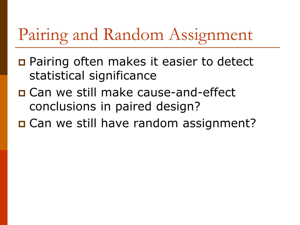 Pairing and Random Assignment • Pairing often makes it easier to detect statistical significance • Can we still make cause-and-effect conclusions in paired design? • Can we still have random assignment?