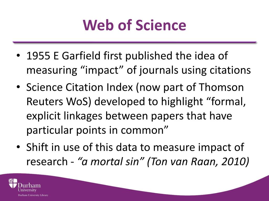 Web of Science • 1955 E Garfield first published the idea of measuring “impact” of journals using citations • Science Citation Index (now part of Thomson Reuters WoS) developed to highlight “formal, explicit linkages between papers that have particular points in common” • Shift in use of this data to measure impact of research - “a mortal sin” (Ton van Raan, 2010)