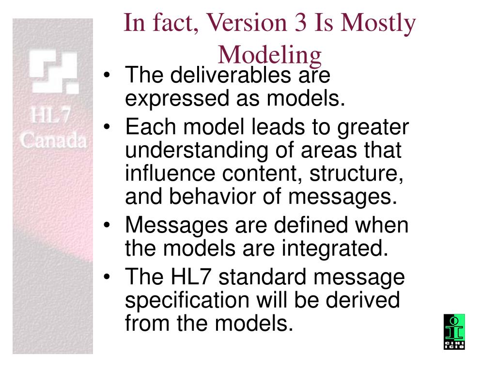 In fact, Version 3 Is Mostly Modeling • The deliverables are expressed as models. • Each model leads to greater understanding of areas that influence content, structure, and behavior of messages. • Messages are defined when the models are integrated. • The HL7 standard message specification will be derived from the models.