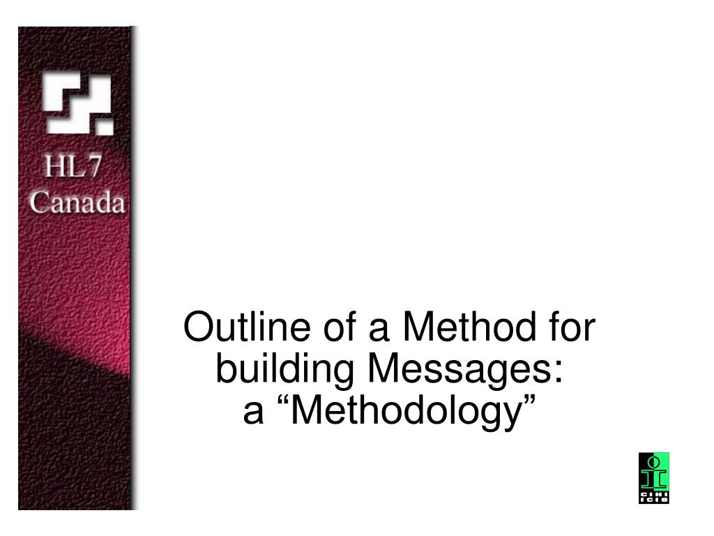HL7 Version 3 Methodology in words 1. Define a consensus reference information model (RIM) that defines the data of interest in the healthcare domain. 2. Assemble the terminologies and data types necessary to express the attributes of the RIM. 3. Apply the model, vocabulary and types to: messages, patient record DTDs, medical logic modules, component specifications, etc. 4. For any particular application, draw from the RIM to construct an abstract message structure - the Hierarchical Message Description (HMD). 5. For any particular implementation technology, HL7 will define an implementation technology specification (ITS) for mapping the HMD to that technology. 6. When the message (or equivalent) is sent, the HMD is used to marshal the data, and the ITS is used to format the data for communication.