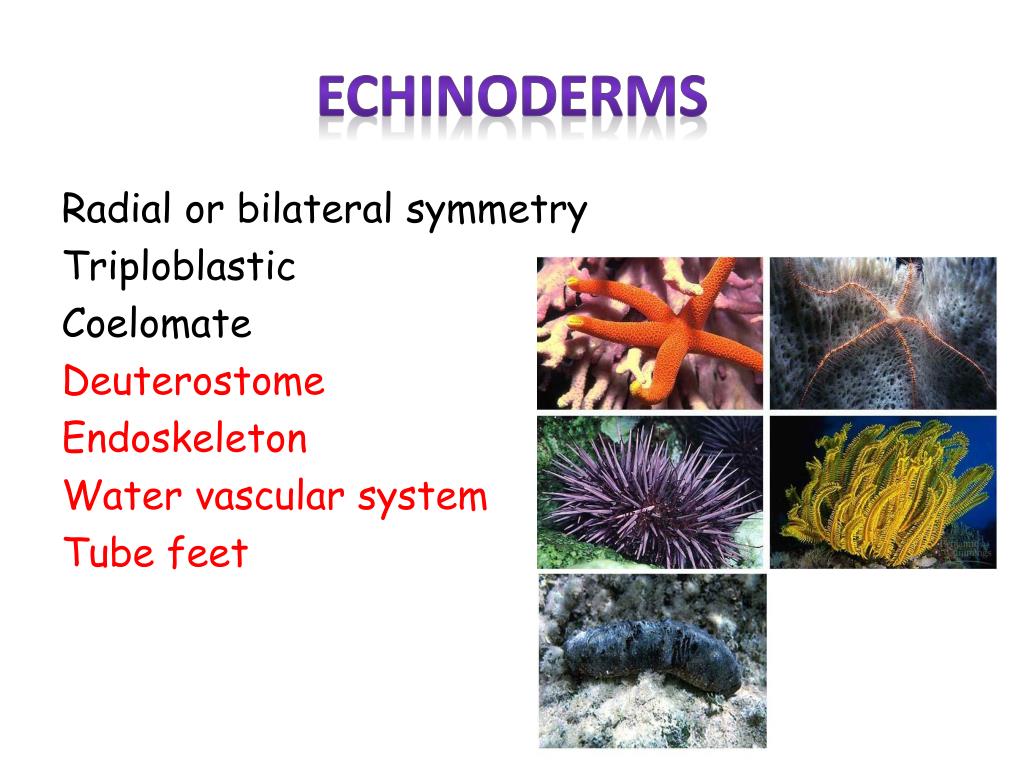 Echinoderms Radial or bilateral symmetry Triploblastic Coelomate Deuterostome Endoskeleton Water vascular system Tube feet