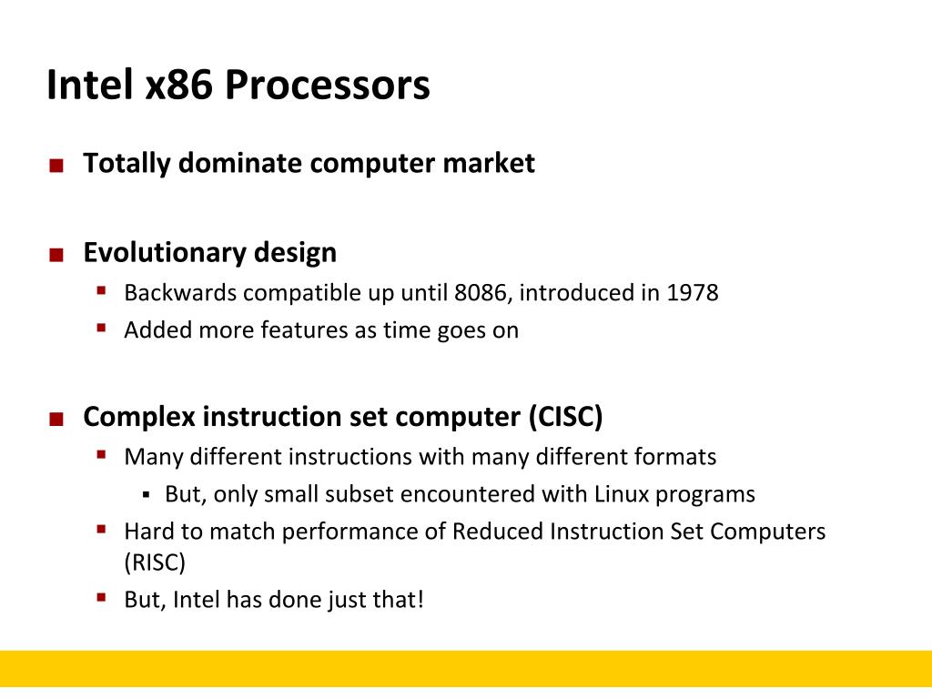 Intel x86 Processors • Totally dominate computer market • Evolutionary design • Backwards compatible up until 8086, introduced in 1978 • Added more features as time goes on • Complex instruction set computer (CISC) • Many different instructions with many different formats • But, only small subset encountered with Linux programs • Hard to match performance of Reduced Instruction Set Computers (RISC) • But, Intel has done just that!