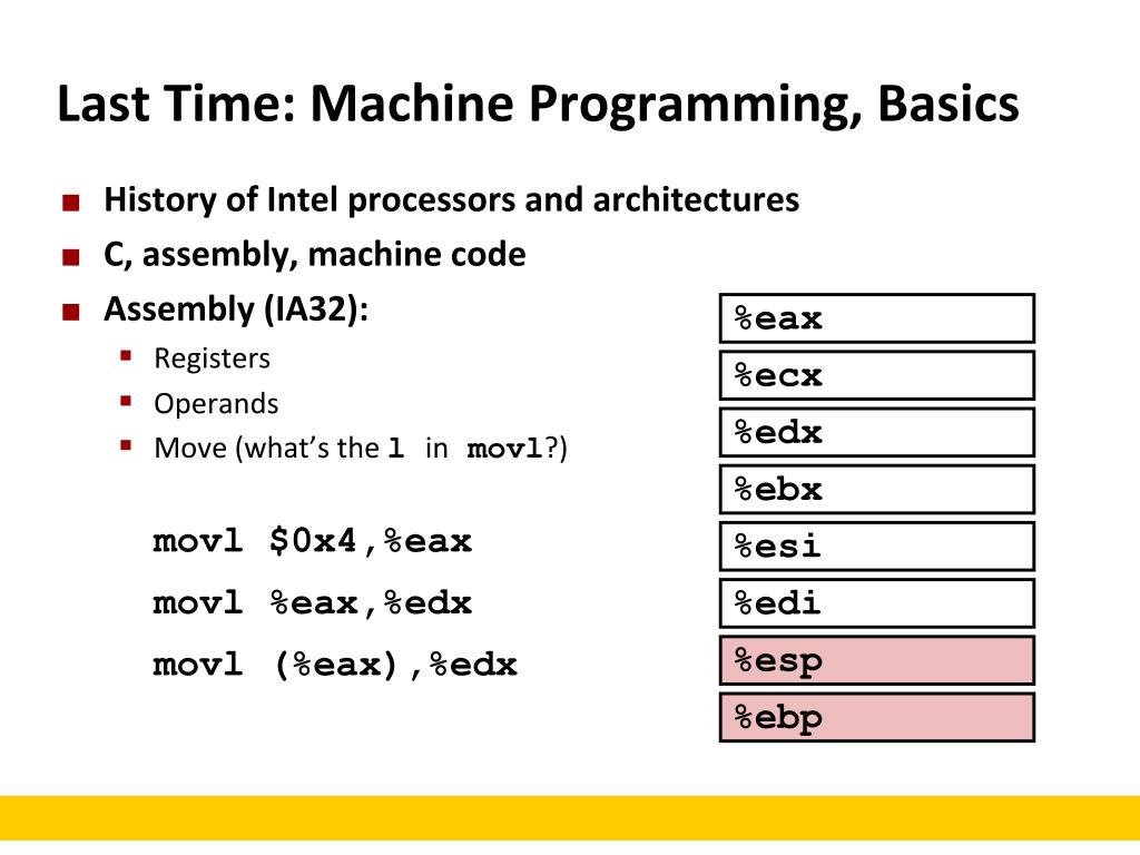 %eax %ecx %edx %ebx %esi %edi %esp %ebp Last Time: Machine Programming, Basics • History of Intel processors and architectures • C, assembly, machine code • Assembly (IA32): • Registers • Operands • Move (what’s the l inmovl?) movl $0x4,%eax movl %eax,%edx movl (%eax),%edx
