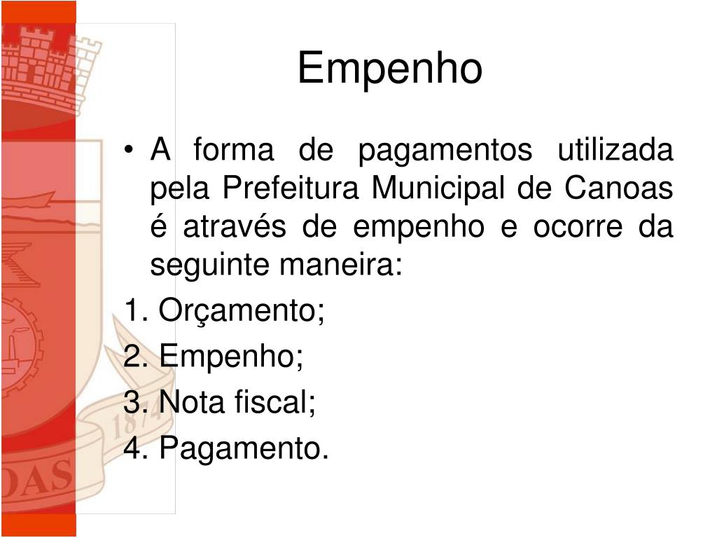 Empenho • A forma de pagamentos utilizada pela Prefeitura Municipal de Canoas é através de empenho e ocorre da seguinte maneira: 1. Orçamento; 2. Empenho; 3. Nota fiscal; 4. Pagamento.