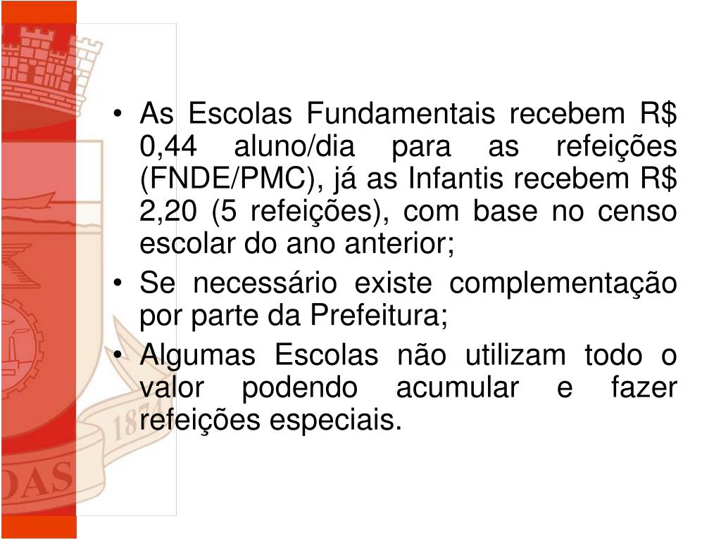 As Escolas Fundamentais recebem R$ 0,44 aluno/dia para as refeições (FNDE/PMC), já as Infantis recebem R$ 2,20 (5 refeições), com base no censo escolar do ano anterior; • Se necessário existe complementação por parte da Prefeitura; • Algumas Escolas não utilizam todo o valor podendo acumular e fazer refeições especiais.