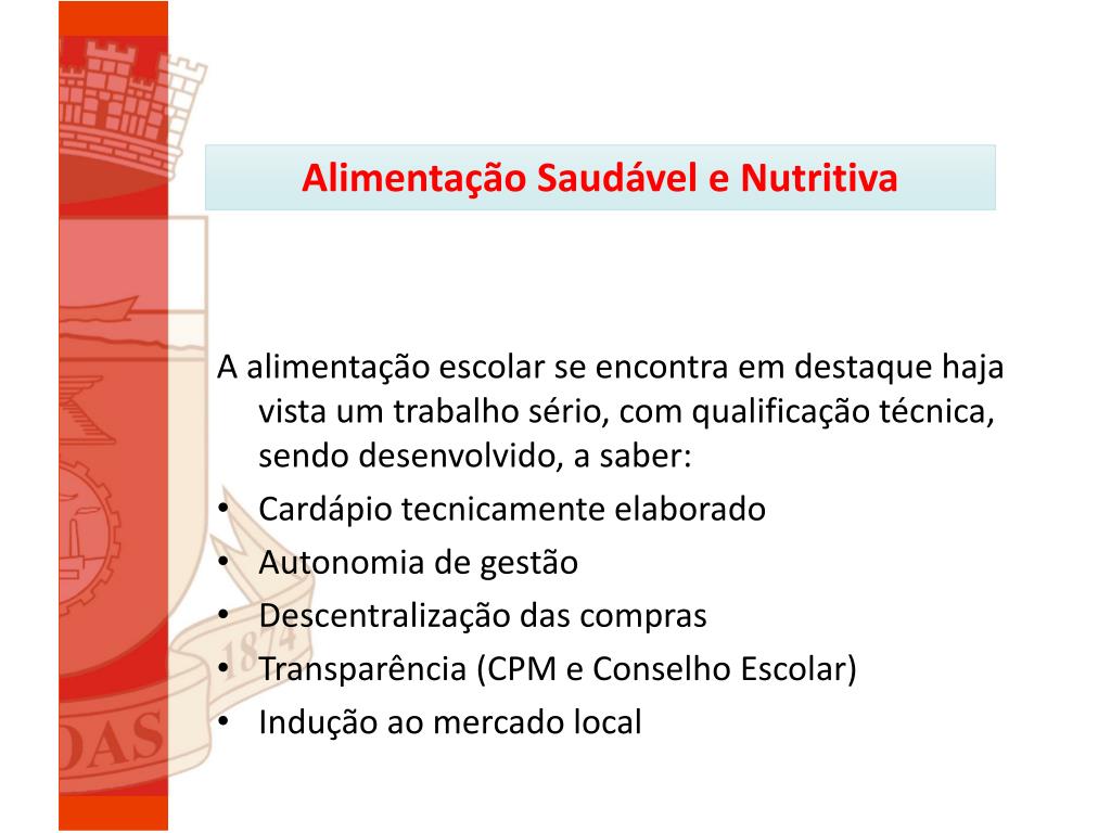 Alimentação Saudável e Nutritiva A alimentação escolar se encontra em destaque haja vista um trabalho sério, com qualificação técnica, sendo desenvolvido, a saber: • Cardápio tecnicamente elaborado • Autonomia de gestão • Descentralização das compras • Transparência (CPM e Conselho Escolar) • Indução ao mercado local