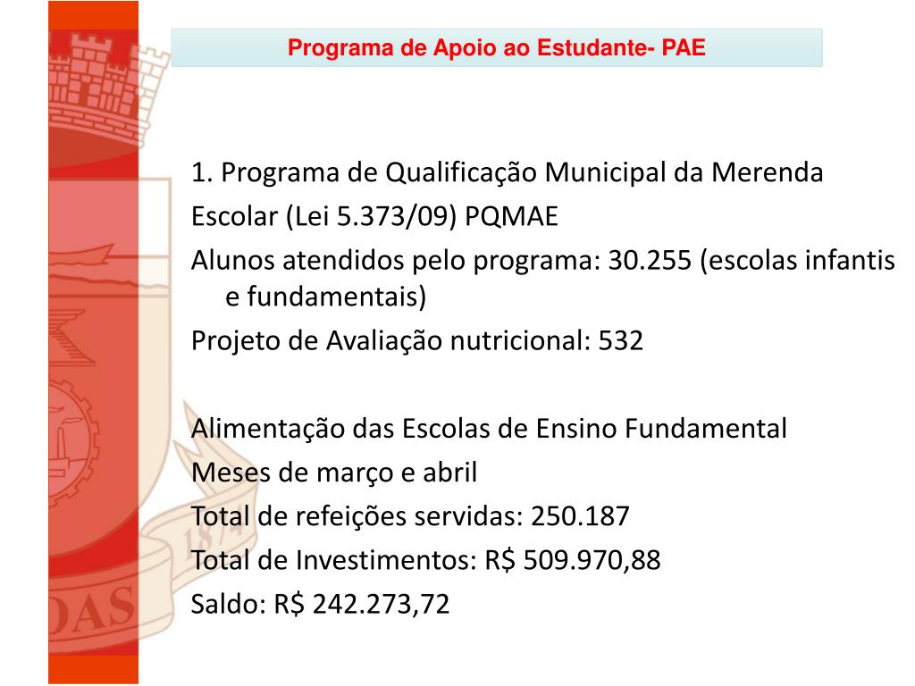 Programa de Apoio ao Estudante- PAE 1. Programa de Qualificação Municipal da Merenda Escolar (Lei 5.373/09) PQMAE Alunos atendidos pelo programa: 30.255 (escolas infantis e fundamentais) Projeto de Avaliação nutricional: 532 Alimentação das Escolas de Ensino Fundamental Meses de março e abril Total de refeições servidas: 250.187 Total de Investimentos: R$ 509.970,88 Saldo: R$ 242.273,72