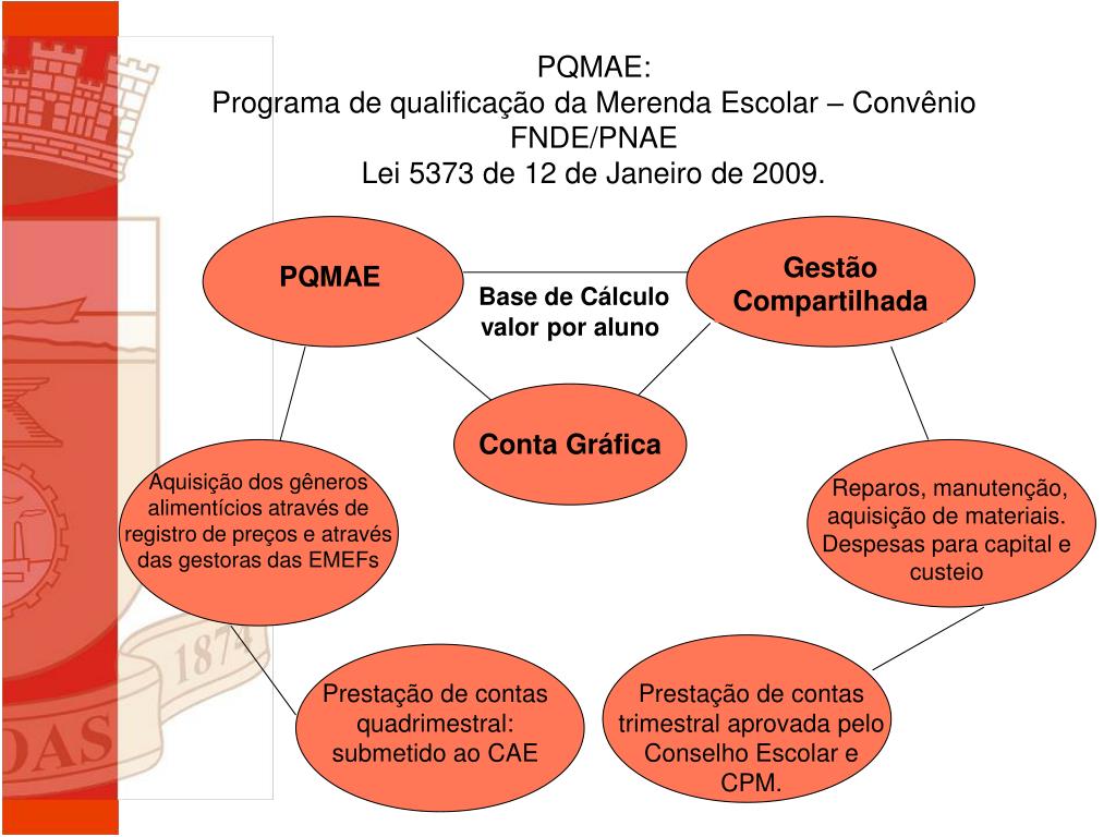 Gestão Compartilhada PQMAE PQMAE:Programa de qualificação da Merenda Escolar – Convênio FNDE/PNAELei 5373 de 12 de Janeiro de 2009. Base de Cálculo valor por aluno Conta Gráfica Aquisição dos gêneros alimentícios através de registro de preços e através das gestoras das EMEFs Reparos, manutenção, aquisição de materiais. Despesas para capital e custeio Prestação de contas quadrimestral: submetido ao CAE Prestação de contas trimestral aprovada pelo Conselho Escolar e CPM.