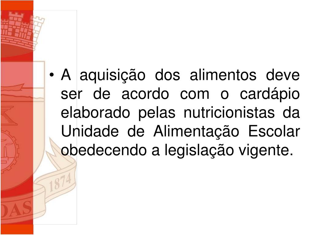 A aquisição dos alimentos deve ser de acordo com o cardápio elaborado pelas nutricionistas da Unidade de Alimentação Escolar obedecendo a legislação vigente.