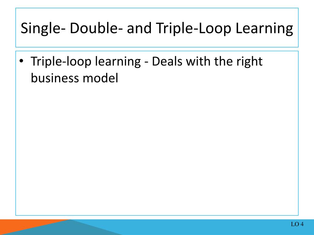 Single- Double- and Triple-Loop Learning Triple-loop learning - Deals with the right business model LO 4