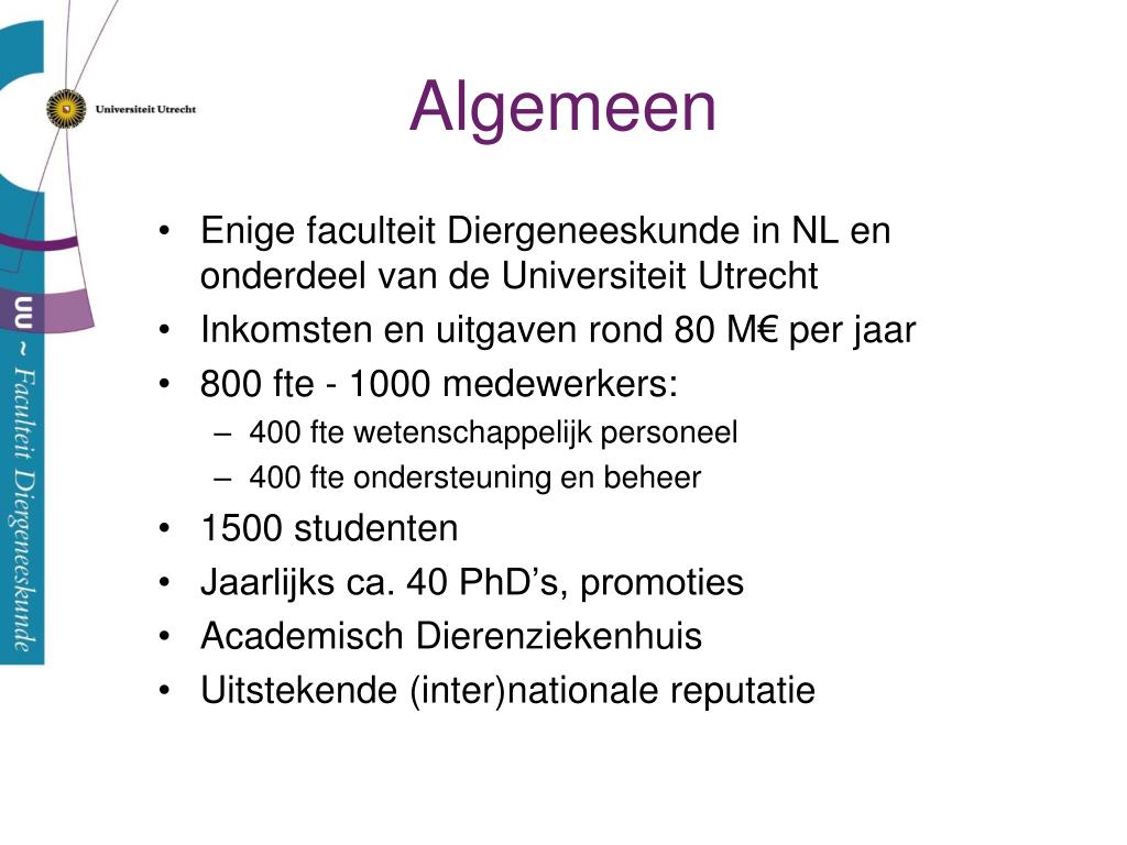 Algemeen • Enige faculteit Diergeneeskunde in NL en onderdeel van de Universiteit Utrecht • Inkomsten en uitgaven rond 80 M€ per jaar • 800 fte - 1000 medewerkers: • 400 fte wetenschappelijk personeel • 400 fte ondersteuning en beheer • 1500 studenten • Jaarlijks ca. 40 PhD’s, promoties • Academisch Dierenziekenhuis • Uitstekende (inter)nationale reputatie