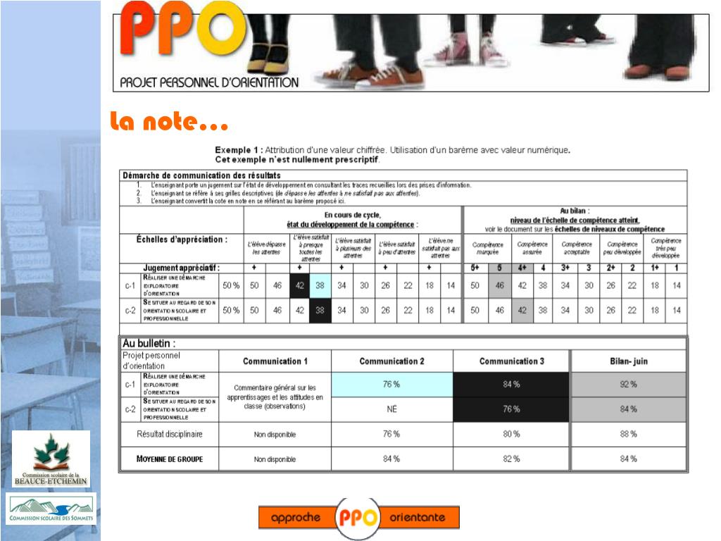 Préparer l’évaluation… • Intentions d'apprentissage à chaque situation ou à chaque étape. • À partir des intentions d'apprentissage, l'enseignant fixe des exigences. • Le PPO étant un cours où les élèves fonctionnent à des rythmes très différents, il sera plus facile de déterminer les exigences pour une étape et de les adapter ensuite à chacune des démarches exploratoires. • Pour déterminer une note à chaque étape, on compare alors les traces recueillies pour chaque élève aux exigences des situations ou aux exigences de l'étape.