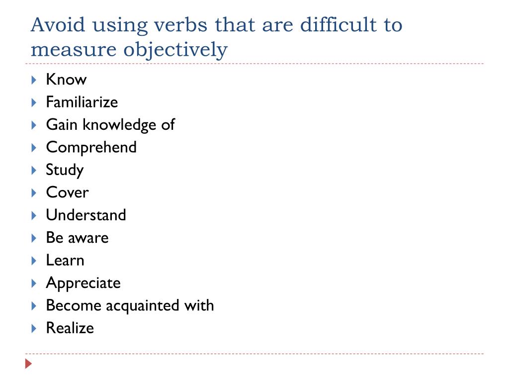 Avoid using verbs that are difficult to measure objectively • Know • Familiarize • Gain knowledge of • Comprehend • Study • Cover • Understand • Be aware • Learn • Appreciate • Become acquainted with • Realize