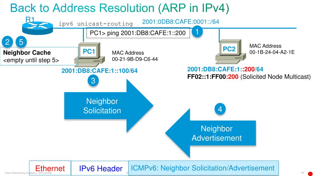 ICMPv6: Neighbor Discovery and Address Resolution (ARP in IPv4)