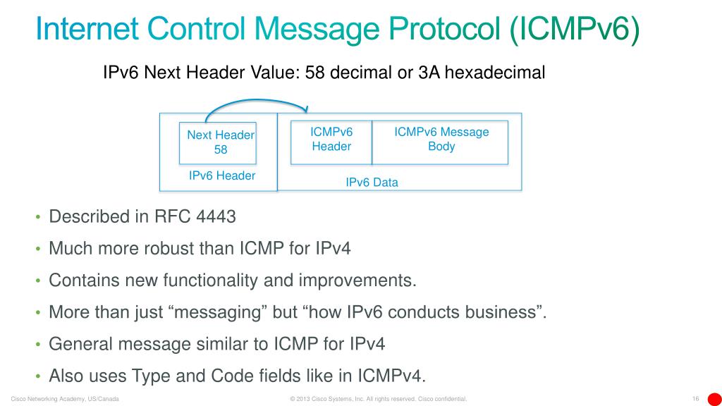 Internet Control Message Protocol (ICMPv6) IPv6 Next Header Value: 58 decimal or 3A hexadecimal • Described in RFC 4443 • Much more robust than ICMP for IPv4 • Contains new functionality and improvements. • More than just “messaging” but “how IPv6 conducts business”. • General message similar to ICMP for IPv4 • Also uses Type and Code fields like in ICMPv4. ICMPv6 Message Body ICMPv6 Header Next Header 58 IPv6 Header IPv6 Data