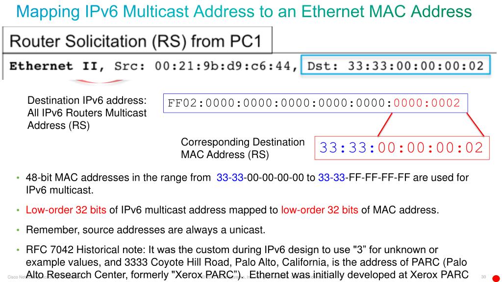 Solicited Node Multicast PC2 How is created? • There is a direct relationship between the unicast/anycast address its solicited node multicast address. • The solicited node multicast address formed by: • Prefix FF02:0:0:0:0:1:FF00::/104 (FF02::1:FFxx:xxxx) • Append the low-order 24 bits of the address (unicast or anycast • Like other multicast addresses, solicited node multicast addresses are also mapped to an Ethernet MAC address. (next)