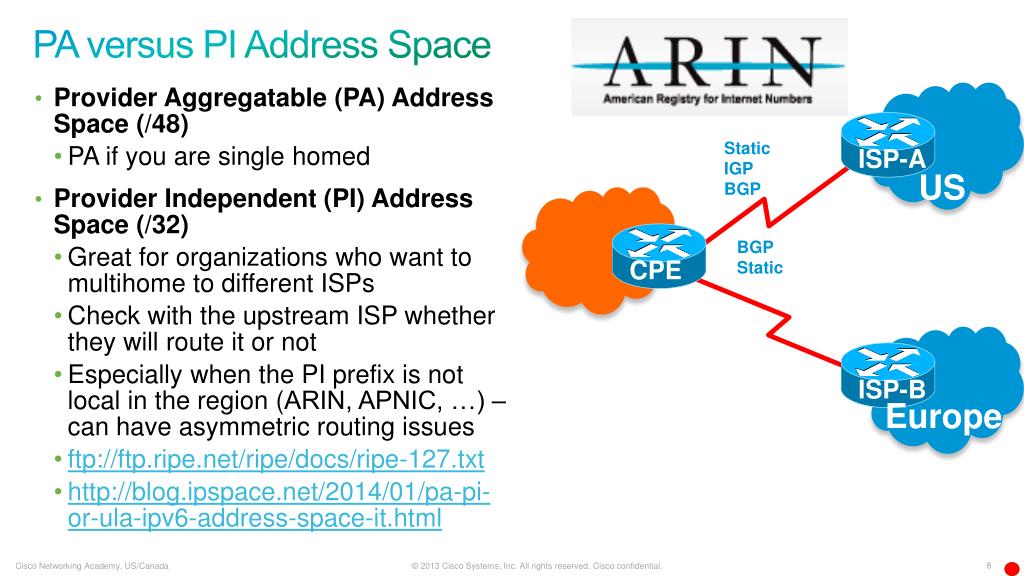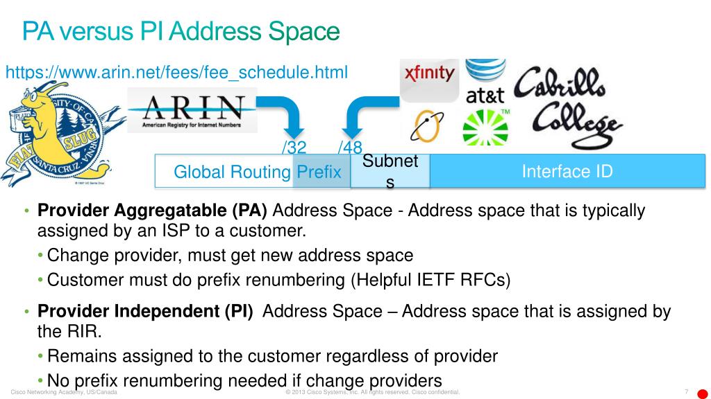 PA versus PI Address Space https://www.arin.net/fees/fee_schedule.html • Provider Aggregatable(PA) Address Space - Address space that is typically assigned by an ISP to a customer. • Change provider, must get new address space • Customer must do prefix renumbering (Helpful IETF RFCs) • Provider Independent (PI) Address Space – Address space that is assigned by the RIR. • Remains assigned to the customer regardless of provider • No prefix renumbering needed if change providers /32 /48 Subnets Interface ID Global Routing Prefix