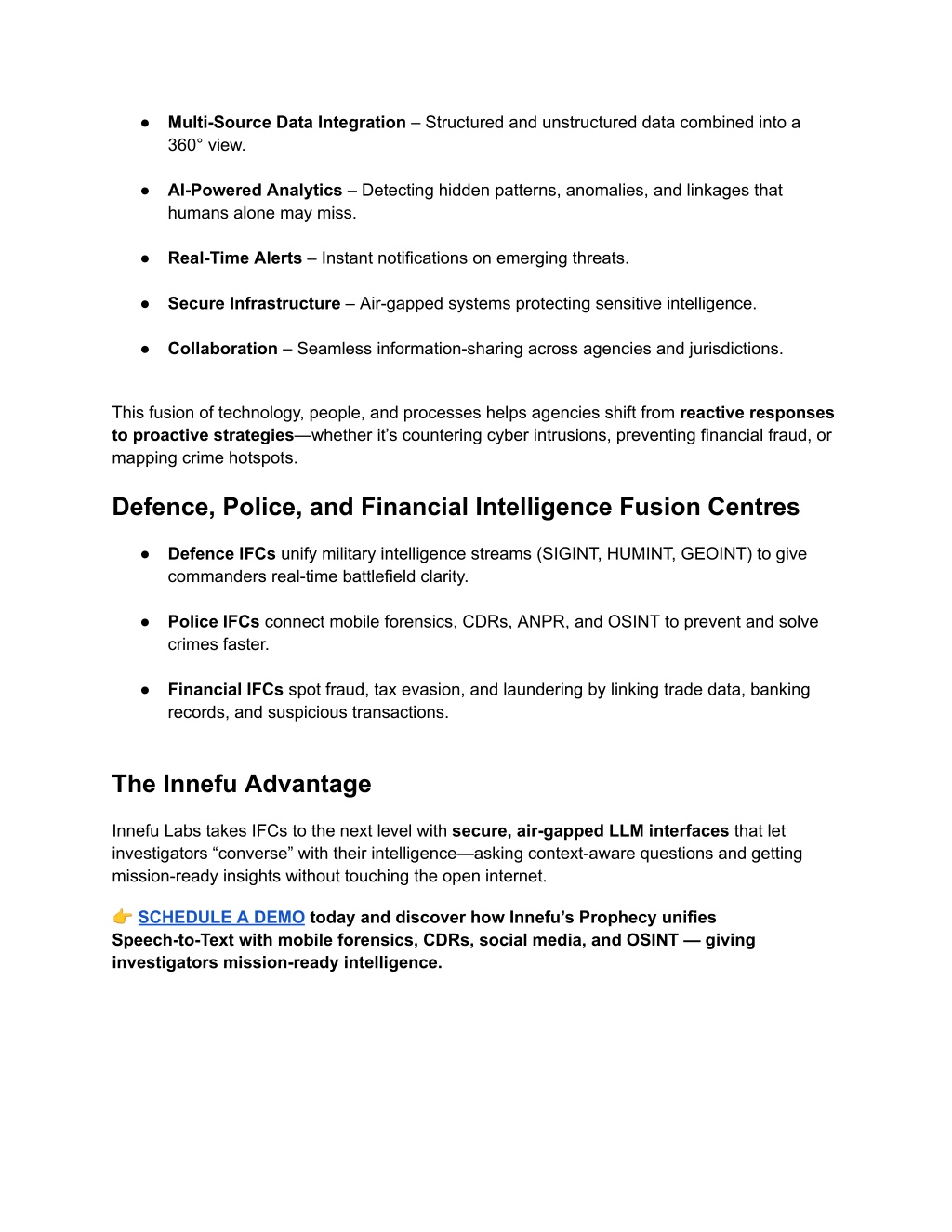 ● Multi-Source Data Integration – Structured and unstructured data combined into a 360° view. ● AI-Powered Analytics – Detecting hidden patterns, anomalies, and linkages that humans alone may miss. ● Real-Time Alerts – Instant notifications on emerging threats. ● Secure Infrastructure – Air-gapped systems protecting sensitive intelligence. ● Collaboration – Seamless information-sharing across agencies and jurisdictions. This fusion of technology, people, and processes helps agencies shift from reactive responses to proactive strategies—whether it’s countering cyber intrusions, preventing financial fraud, or mapping crime hotspots. Defence, Police, and Financial Intelligence Fusion Centres ● Defence IFCs unify military intelligence streams (SIGINT, HUMINT, GEOINT) to give commanders real-time battlefield clarity. ● Police IFCs connect mobile forensics, CDRs, ANPR, and OSINT to prevent and solve crimes faster. ● Financial IFCs spot fraud, tax evasion, and laundering by linking trade data, banking records, and suspicious transactions. The Innefu Advantage Innefu Labs takes IFCs to the next level with secure, air-gapped LLM interfaces that let investigators “converse” with their intelligence—asking context-aware questions and getting mission-ready insights without touching the open internet. ?SCHEDULE A DEMO today and discover how Innefu’s Prophecy unifies Speech-to-Text with mobile forensics, CDRs, social media, and OSINT — giving investigators mission-ready intelligence.