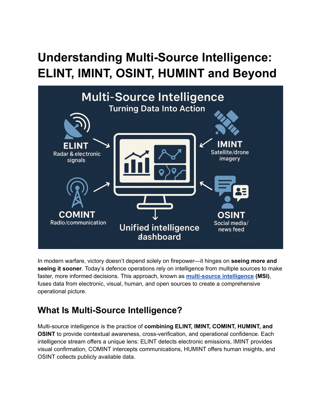 Understanding Multi-Source Intelligence: ELINT, IMINT, OSINT, HUMINT and Beyond In modern warfare, victory doesn’t depend solely on firepower—it hinges on seeing more and seeing it sooner. Today’s defence operations rely on intelligence from multiple sources to make faster, more informed decisions. This approach, known as multi-source intelligence (MSI), fuses data from electronic, visual, human, and open sources to create a comprehensive operational picture. What Is Multi-Source Intelligence? Multi-source intelligence is the practice of combining ELINT, IMINT, COMINT, HUMINT, and OSINT to provide contextual awareness, cross-verification, and operational confidence. Each intelligence stream offers a unique lens: ELINT detects electronic emissions, IMINT provides visual confirmation, COMINT intercepts communications, HUMINT offers human insights, and OSINT collects publicly available data.