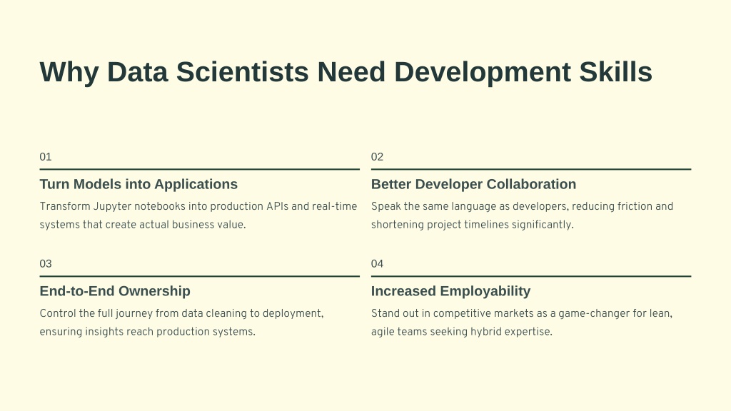 Why Data Scientists Need Development Skills 01 02 Turn Models into Applications Better Developer Collaboration Transform Jupyter notebooks into production APIs and real-time systems that create actual business value. Speak the same language as developers, reducing friction and shortening project timelines significantly. 03 04 End-to-End Ownership Increased Employability Control the full journey from data cleaning to deployment, ensuring insights reach production systems. Stand out in competitive markets as a game-changer for lean, agile teams seeking hybrid expertise.