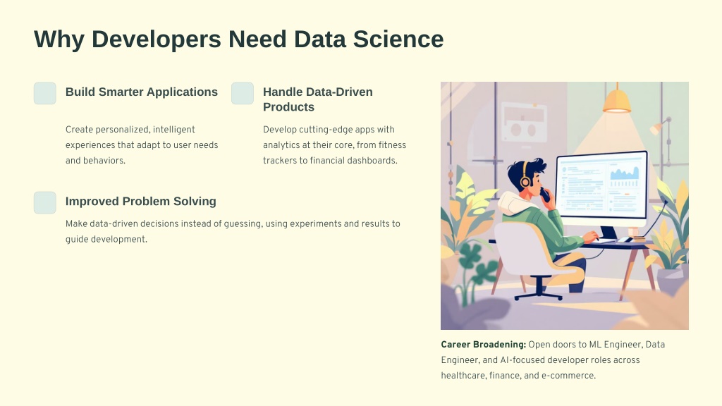 Why Developers Need Data Science Build Smarter Applications Handle Data-Driven Products Create personalized, intelligent experiences that adapt to user needs and behaviors. Develop cutting-edge apps with analytics at their core, from fitness trackers to financial dashboards. Improved Problem Solving Make data-driven decisions instead of guessing, using experiments and results to guide development. Career Broadening: Open doors to ML Engineer, Data Engineer, and AI-focused developer roles across healthcare, finance, and e-commerce.