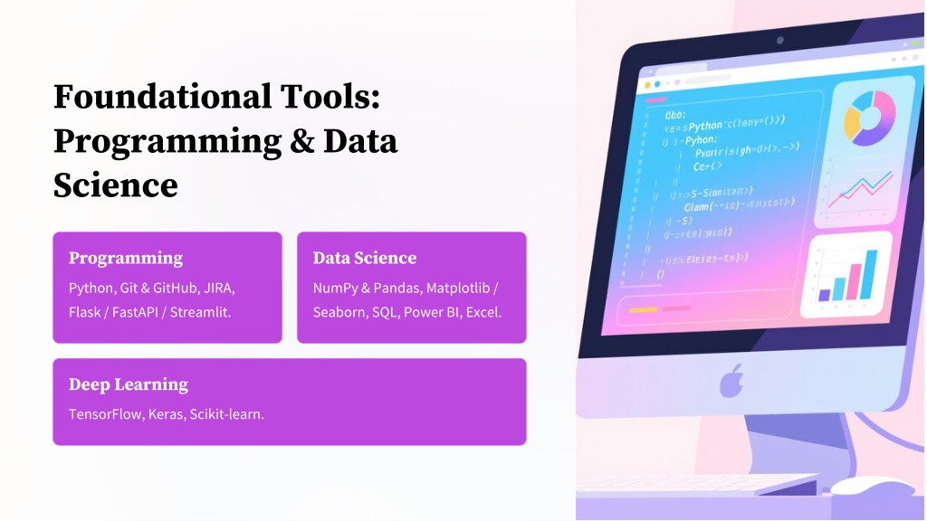 4. Foundational Tools: Programming & Data Science Programming Data Science Python, Git & GitHub, JIRA, Flask / FastAPI / Streamlit. NumPy & Pandas, Matplotlib / Seaborn, SQL, Power BI, Excel. Deep Learning TensorFlow, Keras, Scikit-learn.
