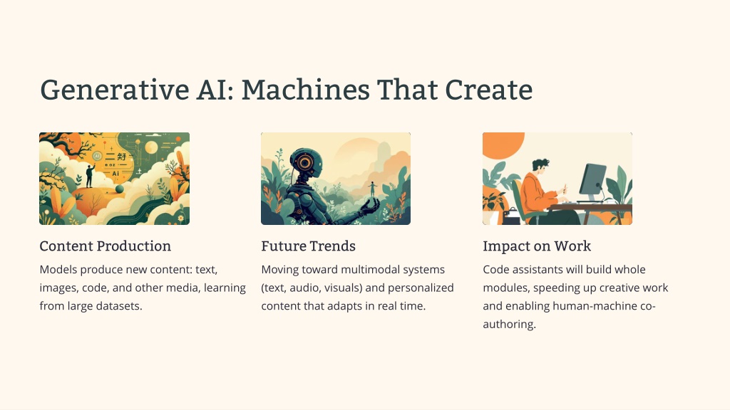 Generative AI: Machines That Create Content Production Future Trends Impact on Work Models produce new content: text, images, code, and other media, learning from large datasets. Moving toward multimodal systems (text, audio, visuals) and personalized content that adapts in real time. Code assistants will build whole modules, speeding up creative work and enabling human-machine co-authoring.